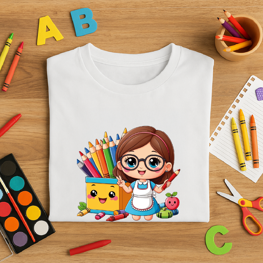 Un diseño encantador con una maestra caricaturesca y un set de lápices de colores ✏️🖍️ que simbolizan creatividad y educación. Confeccionado en algodón 30/1 básico o 20/1 premium.