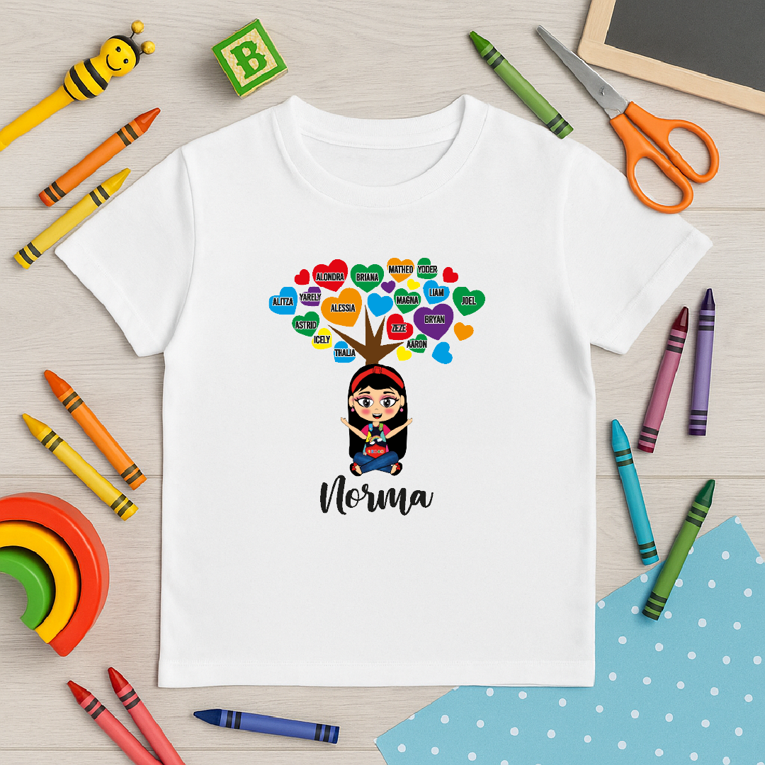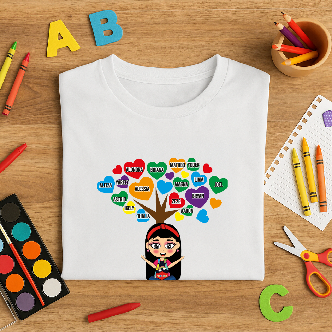 Un diseño simbólico con un árbol de corazones 🌳💚 donde se pueden incluir los nombres de los alumnos. Ideal para maestras de inicial y primaria.
