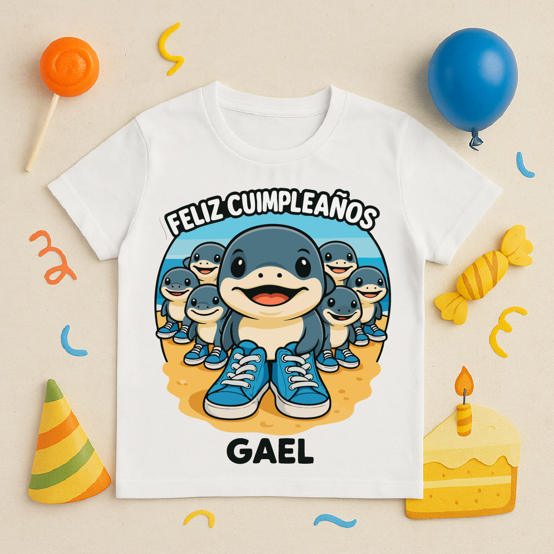 Un diseño divertido y lleno de energía para celebrar los cumpleaños infantiles. Confeccionado en algodón 30/1 básico o 20/1 premium, este polo ofrece suavidad y comodidad. El estampado en DTF de alta calidad resalta los detalles del tiburón caricaturesco con colores vivos. También disponible en versión sublimada sobre algodón spum (20/1 y 30/1).